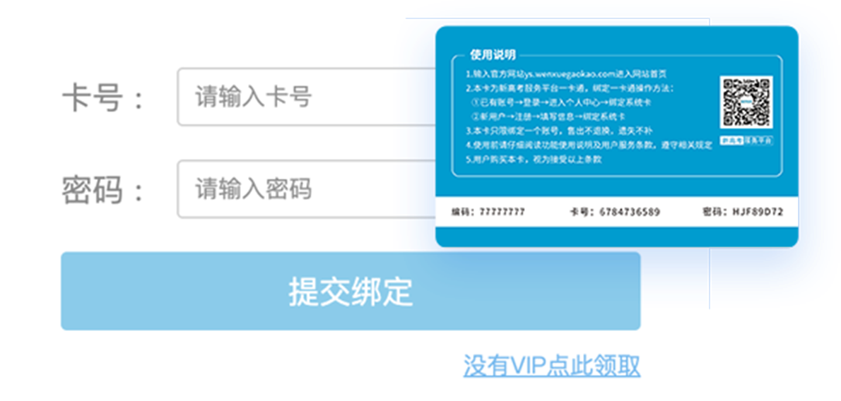 刮开卡片背面的密码涂层,在框内输入卡片的卡号和密码,点击提交绑定!(